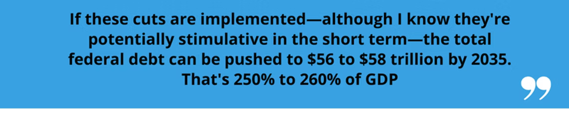 "In Principles for Dealing with the Changing World Order, Ray Dalio, a renowned investor, implies that unchecked debt burdens can trigger systemic financial instability and diminish the influence of a nation on the global stage, and I wholeheartedly agree," says Urbina. He argues that adding to the pressure are proposed tax cuts that could remove $5.3 to $6 trillion from federal revenues over the next decade.